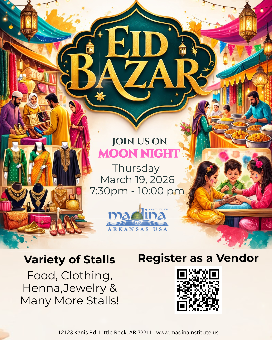 Enjoy a variety of stalls featuring food, henna, clothing, jewelry, and much more.