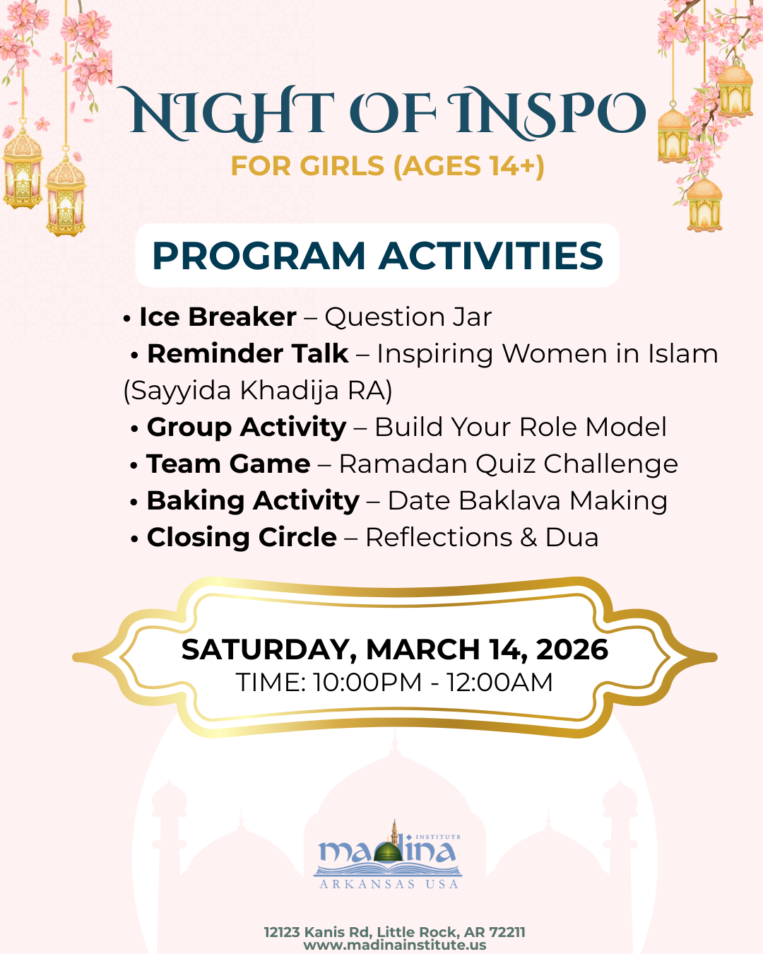 Join us on Saturday, March 14, 2026 | 10:00 PM – 12:00 AM for a night of learning, reflection, and fun.
